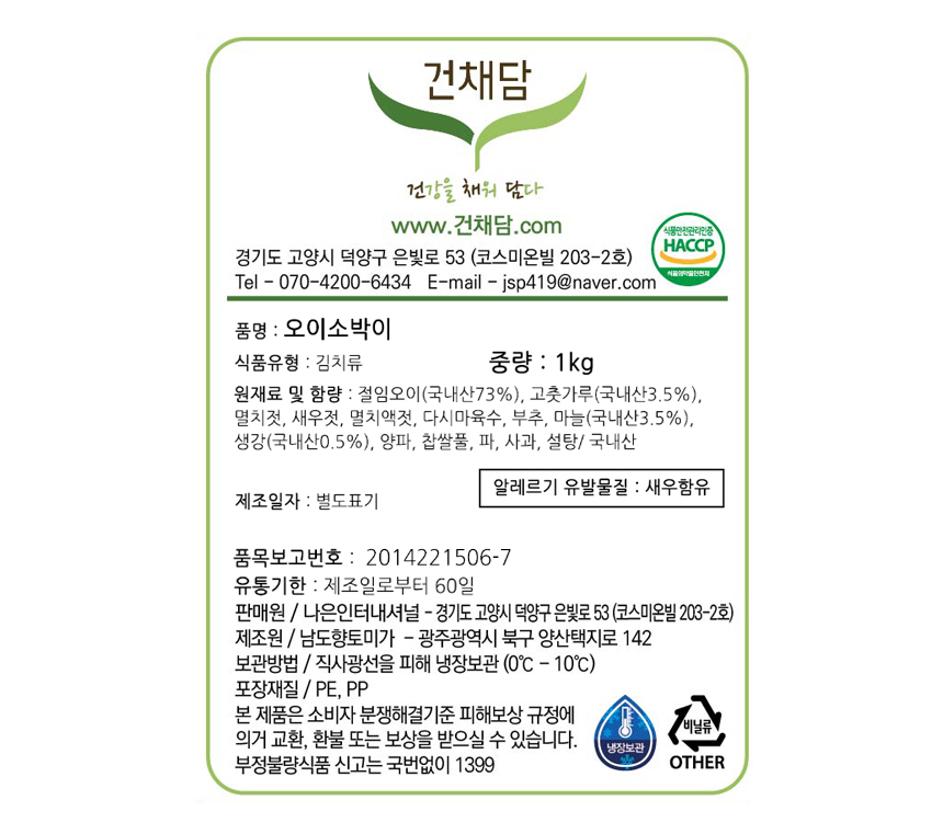 (계절한정 김치 6월) 건채담 오이소박이 1kg